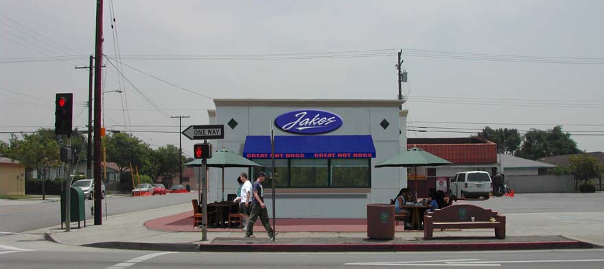 Existing: Hot dog stand with exposed roof-top equipment and nonconforming pole sign to be re-opened with minimal exterior remodeling.